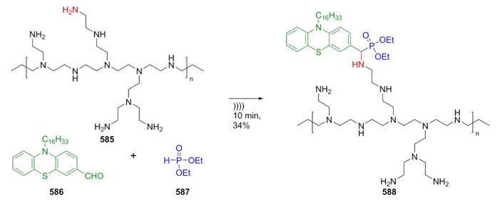 Based on recent studies of fluorescent nanoparticles, Wan, Zhang, Wei et al. developed the first synthetic procedure to prepare active organic nanoparticles via the Kabachnik-Fields reaction, which were further evaluated in HeLa cervical cancer cell line [109]. Aggregation-induced emission-active aldehyde 586 was mixed with polyetherimide 585 and diethyl phosphite (587) under solvent and catalyst-free conditions using ultrasound heating affording product 588 in moderate yield (Scheme 87). This compound was synthesized under environmentally friendly conditions, and it exhibits potential activity for bioimaging due to its amphiphilic character. Likewise, this polymer may work as a cell biomarker because it exhibits biocompatibility with HeLa cell line.