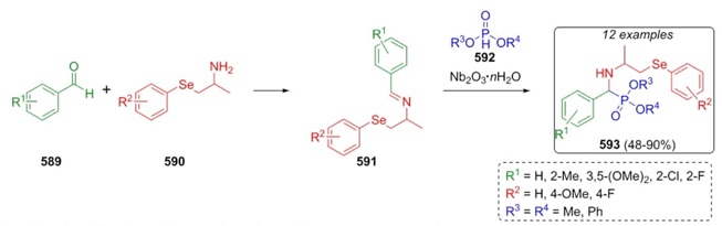 In 2018, Wilhelm, Silva et al. reported the synthesis of twelve novel selanyl-a-amino phosphonates via a Kabachnik-Fields reaction [110] (Scheme 88). After the previous preparation of selenide amines 590, the combination of aldehydes 589 with selenide amines 590, and phosphonates 592 under solvent-free conditions catalyzed by niobium oxide allowed the preparation of organylselanyl α-amino phosphonates 593 in moderate to good yields (48-90 %). The use of diphenylphosphite and 3,5-dimethoxybenzaldehyde decreased the yields. Instead that, aldehydes substituted at the ortho position gave the best yields in the same way that the aryl groups in the selenide amine. These compounds were evaluated behind their antioxidant properties, as well as enzymatic inhibition properties.