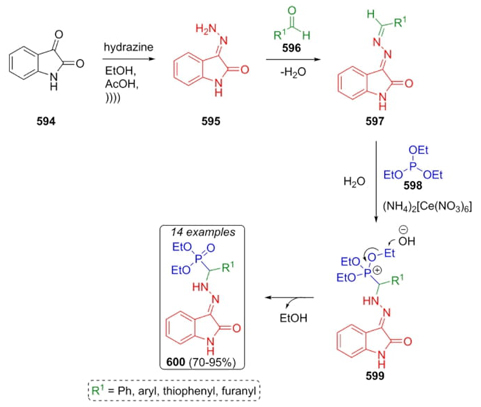 Nikalje et al. worked in 2018 on the synthesis of some new phosphonate-containing indolinones via a Kabachnik-Fields reaction. The synthesized compounds were probed against a panel of cancer cell lines such as MCF-7, IMR-32, SK-MEL-2, MG-63, to name a few [111]. Starting from indoline 594, it was was formed the hydrazone 595 in the presence of hydrazine and acidic conditions. Thus, aldehydes 596, hydrazone 595, and triethylphosphite (598) were sequentially combined in the presence of ceric(IV) ammonium nitrate as a green catalyst at room temperature to synthesize the products 600 in good to excellent yields (70-95 %) (Scheme 89). Mechanism suggests that first were achieved imines 597. Then, the catalyst promotes imines 599 formation, as well as the nucleophilic attack of phosphite 598 to give the intermediates 599. Finally, water in the media reacts with phosphonium ions to achieve the Kabachnik-Fields products 600. It is noteworthy the environmentally friendly conditions (EtOH, AcOH and ultrasound irradiation) involved in this synthetic strategy as well as potential biological activity on cancer cell lines.