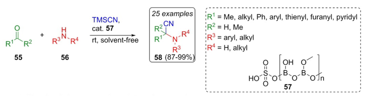 Chaturbhuj et al. reported an efficient and low toxic strategy involving the use of a solvent-free organocatalyzed Strecker reaction between aldehydes 55, amines 56, TMSCN and borate catalyst 57 at room temperature to afford in up to 30 minutes the products 58 shown in Scheme 9 in good to excellent yields (87-99%) [19]. In scope, different electron-donating and electron-withdrawing groups were evaluated, as well as polar and non-polar solvents, finding that the best reaction condition was under a solvent-free environment. In addition, the effect of the catalyst on the reaction was proven using a panel of Lewis and Brønsted acids, resulting to be the sulfated polyborate the best one. Finally, many advantages of the trimethylsilyl cyanide (TMSCN) as a cyanide source were demonstrated, but mainly safe use, ease of handling, and effectiveness.