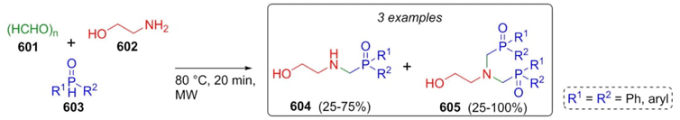 In 2019, Bálint et al. developed a methodology consisting of a double Kabachnik-Fields from aminoalcohols as key reagents (Scheme 90) [112]. Thus, paraformaldehyde (601), 2-aminoethanol (602), and phosphine oxides 603 were reacted together using microwave irradiation as a heat source in acetonitrile as a solvent and under catalyst-free conditions to afford products 604 and 605 in good yields (up to quantitative yields in the case of 605). In this procedure, it was a functional range of temperatures (from 80 to 100 °C), and a quantity of reagents that gave both products. Authors found also that the use of an excess of paraformaldehyde at 80 °C, promotes the formation of both Kabachnik-Fields products.
