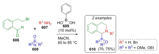 Ordóñez et al. reported in 2019 a new strategy to synthesize 1,2,3,4-tetrahydroisoquinoline-1-phosphonic- and -1-phosphinic acids 610 via a Kabachnik-Fields reaction (Scheme 91) [113]. Thus, aldehyde 606, amines 607, and phosphites 608 were combined in acetonitrile at 60 to 85 °C under catalytic amounts of phenylboronic acid (609) (10 % mol) to afford the products 610 in moderate yields (70-75 %). This study aimed to obtain analogues of 1,2,3,4-tetrahydroisoquinoline-1-carboxylic acid through isosteric replacement of phosphonic acid instead of carboxylic acid fragment via an MCR-based synthesis under mild reaction conditions.