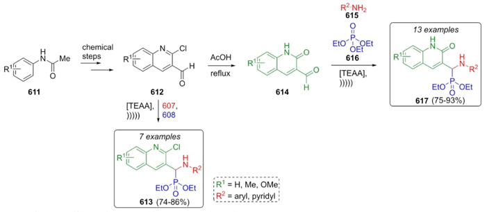 Bazine et al. developed a rapid and efficient methodology to prepare new α-amino phosphonates through a Kabachnik-Fields reaction as a key step. The synthesized compounds were evaluated as antioxidants and enzymatic inhibitors (Scheme 92) [114]. To prepare the quinoline-type reagents 612 it was employed a Meth-Cohn multistep reaction sequence starting from amides 611. Then, compounds 612 were treated under mild acidic conditions to afford oxoquinolines 614. Thus, quinolines 614, amines 615, and triethyl phosphate (618) were then subjected to Kabachnik-Fields reaction conditions in liquid ionic TEAA (triethylammonium acetate) using ultrasound irradiation to synthesize the corresponding products 613 and 617 in moderate to good yields (up to 93 %). Liquid ionic TEAA promoted high yields and in short reaction time. In addition, this procedure has a few advantages over previous ones. For instance, short reaction times, high yields in one-pot procedure, the products were afforded without purification by chromatography, and ease of experimental operation.