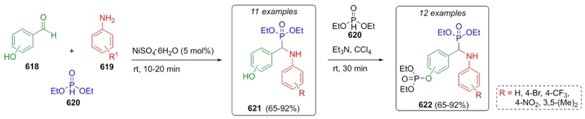 Guezane-Lakoud et al. developed a synthetic strategy towards the synthesis of new phosphates a-aminophosphonates through a Kabachnik-Fields-3CR as the first step of such procedure, followed by an Atherton-Todd reaction [115]. Sequential combination of hydroxybenzaldehydes 618, anilines 619, and diethylphosphite (620) using nickel(II) sulfate as a catalyst allowed the formation of the new α-aminophosphonates 621 in moderate to good yields (65-92 %) (Scheme 93). Then, phosphates α-aminophosphonates 622 were obtained through an Atherton-Todd reaction condition from compounds 621. Precursors with substitution at ortho and para positions of benzaldehydes afforded the best yields in comparison to those from benzaldehydes substituted in meta position. The use of anilines with electron-rich or deficient groups did not affect the yields. Also, it is worth highlighting the solventless conditions, room temperature, and short times for all the processes.