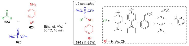 Hernández-Fernández, Robledo-Leal, López-Cortina et al. reported the synthesis of a-aminophosphonates and their antifungal evaluation against L. prolificans [116]. Thus, aromatic, and heterocyclic aldehydes 623, para-substituted anilines 624, and diphenyl phosphite (625) were reacted together in a one-pot process using MW as a heat source without catalysts to produce the a-aminophosphonates 626 in moderate to good yields (11-85 %) (Scheme 94). It is important to highlight the eco-friendly reaction conditions that were used. Low reactivity was observed in some products probably due to the use of low activated 4-dimethylaminocinnamaldehyde, which promoted the formation of undesirable side products.