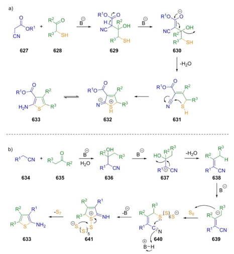 The reaction developed by Karl Gewald in 1966 has two experimental ways to be carried out. One of them is a 3-CR [117]: a) the first version (Gewald-2CR): mercaptocarbonyl reagents 628 are condensed with base-activated nitriles 627 to achieve intermediate-type mercaptonitriles 629, which after a rearrangement/cyclization process on compounds 630, 631 and 632 gave the 2-aminothiophenes 633 (Scheme 95a); and b) second version (Gewald-3CR): the first step consists of a Knoevenagel condensation between carbonyl compounds (aldehyde or ketone) 635 and base-activated nitriles 634 to give cyano alcohols 636, that after a deprotonation achieved intermediates 637, and a dehydration to furnish intermediates 638 was ensembled towards the corresponding acrylonitriles 639, which were thiolated with elemental sulfur at active methylene position to give the sulfur-containing-intermediates 640. Finally, 2-aminothiophenes 633 were furnished through annulation promoted by intramolecular nucleophilic attack by mercaptide in precursors 641 (Scheme 95b) [118].