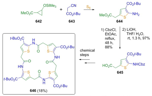 Reissig et al. developed a synthetic procedure to synthesize complex macrocyclic peptidomimetics containing the 5-aminothiophene moiety as the main building block [119]. For this one, it was necessary to improve a Gewald three-component reaction. Thus, after combining cyclopropanecarboxylate 642, methylene-activated nitriles 643, and elemental sulfur, thiophene 644 was afforded in a sequence involving a ring-opening process from compound 642 and a further condensation with nitrile 643 and elemental sulfur (Scheme 96). Amine functionalization of compound 644 furnished the product 645, which was used as unit for construction of the peptidic macrocycle 646. The key step in this methodology was the Gewald reaction, which allowed the incorporation of thiophene fragment into macrocycle 646.