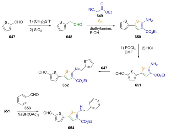 In 2011, Skene et al. synthesized a couple of fluorescent aminobisthiophenes via a Gewald reaction as second step of both synthetic procedures (Scheme 97) [120]. Starting from 2-thiophene carboxaldehyde (647), trimethylsulfonium iodide and SiO2 were added to give the 2-thienylacetaldehyde (648), which was combined under a Gewald 3CR protocol with nitrile-ester 649 and sulfur to obtain the product 650 in 25 % yield per two steps. Compound 650 was then formylated using POCl3 under Vilsmeier-Haack conditions. Then, Base bis-thiophene containing Schiff 652 was prepared by treatment of aldehyde 647 with bis-thiophene 651. Additionally, subsequent reductive alkylation of aminobisthiophene 651 with benzaldehyde (653) achieved the bis-thiophene-containing product 654. Gewald reaction allowed incorporating a second thiophene ring, which increases the optical activity of the whole compounds helped by the presence at the same time of electron-rich and deficient groups (push-pull effect).