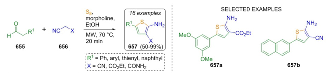 Hesse et al. reported a rapid and efficient procedure to prepare the new 5-aryl 2-aminothiophenes 657 via a Gewald reaction under microwave heating conditions (Scheme 98) [121]. Thus, aldehydes 655, nitriles 656, and elemental sulfur were mixed under microwave- heating conditions to achieve the products 657 in moderate to good yields (50-99 %). Also, the synthesis of 657 was performed but under conventional heating conditions, and the products were afforded in lower yields. It can be noted that microwaves as a heat source are optimal for decreasing reaction times. This approach allowed synthesizing 2,4,5-substituted thiophenes in short times and with high chemical yields.
