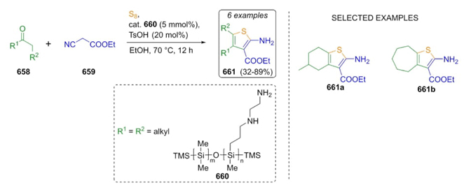Based on the idea that polysiloxanes are environmentally friend catalysts, Lai, Xu et al. worked in 2012 on a creative and green approach, in which amine-functionalyzed polysiloxanes were used as catalysts in a Gewald reaction (Scheme 99) [122]. Ketones 658, methylene-activated nitrile 659, and elemental sulfur were sequentially mixed using the amino catalyst 660 to generate the aminothiophenes 661 in moderate to good yields (32-89 %). Ketones worked well in such reaction, regardless of low reactivity mainly by stereoelectronic effects. Thus, to solve the problem that ketones afforded low yields due to their limited reactivity, catalyst 660 helped the process successfully. The size of the ketone ring influenced yields, 6-membered ring ketones afforded the best yields instead of 5 or 7 membered ketones.