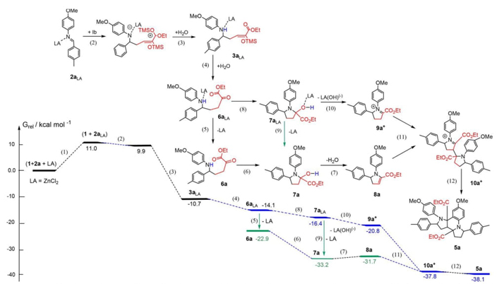 In Mannich-type reactions (previously discussed) [60], a combination of dienediolates and imines follows a pathway giving stable intermediates produced after a Pictet−Spengler-type cyclization. A nice energy profile was computed by Schneider et al. through DFT formalism using M06-D3/LACVP**/PBF method including London dispersion interactions using acetonitrile as the best solvent, Fig. 2.