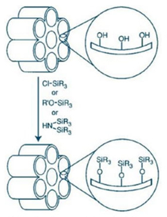 A widely employed material is the hexagonal MCM-41 (Mobil Composition of Matter), which became the focus for scientists due to its potential applications, both as a catalyst and as support [22]. In 2002, the encapsulation of copper complexes within MCM-41 and the partial oxidation of phenol was reported. The system demonstrated to be a good support and an excellent selective catalyst to produce catechol. Moreover, the absence of leaching copper through the process was observed [23]. A major limitation of this catalyst is its use in acidic conditions, as silica materials have low intrinsic stability in this environment. To overcome this problem, scientists studied the incorporation of strong acidic functional groups, like alkyl- or aryl-sulfonic acid, on the silica surface. It has been reported that these groups produce higher numbers of improved acid centres and enhance the activity in reactions catalyzed by the acid function. In 2005, Boveri and collaborators reported a method to prepare HSO3-functionalized MCM-41, as shown in Fig. 1; the materials were tested as catalysts for the reaction of benzene alkylation with 1-dodecane with moderate activity and good selectivity to 2-phenyl dodecane [24]. This methodology was also evaluated in the catalysis of stearic acid with glycerol, presenting interesting results like the selectivity to monoglyceride and the inhibition of di- and triglycerides, and the relation between the pore size and the increment of the activity in the reaction [25]. In 2010, the incorporation of Brønsted acid sites from HSO3 to Co-Mo/MCM-41 catalyst was presented in the treatment of heavy oil, performing sulfur removal and improving the properties of the expected products [26].