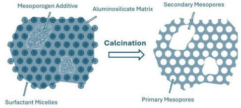 Controlling the size of the pores is a property that can be useful when the molecules cannot access or leave the pores of the zeolite. A reported strategy is to produce mesopores within the channels of these systems with the addition of agents that can generate mesopores in the zeolites (mesoporogenic agents), as shown in Fig. 2 [40]. In 2014, a study presented the synthesis of zeolite ZSM-5 with the addition of carbon nanoparticles and chitosan (biopolymer derived from crustacean shells); these additives changed the Si/Al ratio in the material and improved the pore sizes and volumes compared to the pure zeolite. The materials showed an interesting route for the catalytic cracking of low-density polyethylene (LDPE) to fuel [39].