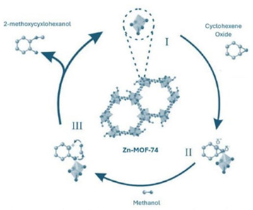 In 2023 several studies were made to demonstrate that these open metal sites could work in the alcoholysis of cyclohexene oxide using MOFs as catalysts. SU-101 (Stockholm University) presented conversion over 99 % with methanol, over 96 % with ethanol and over 24 % with propanol; the material presented retention of the catalytic activity over 5 cycles and a mechanism was proposed involving the Bi+3 open metal sites in the MOF [54], MOF-74 presented over 90 % conversion using methanol at 50 °C in less than 2 days, presenting no degradation, leaching or loss in the catalytic activity over 3 cycles [55] the mechanism is shown in Fig. 3. MOF-74 has also been used as a catalyst with different metal sites in the oxidation of styrene to benzaldehyde using peroxides as oxidants, where Cu-MOF-74 reported the highest yield, and Zn-MOF-74 acted as an inhibitor rather than as a real catalyst [56].