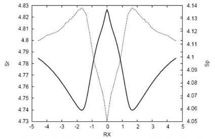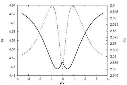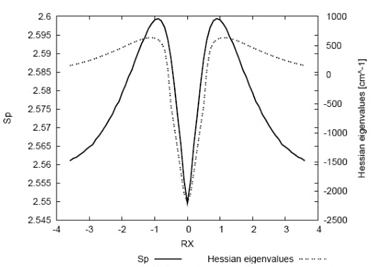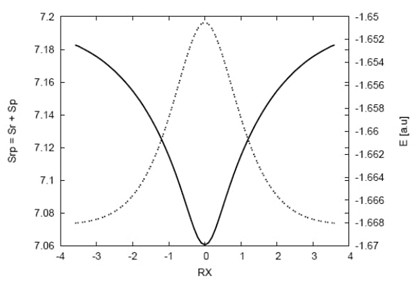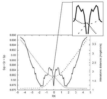 Fig. 7 Shannon entropy in momentum space (solid line) and the bond distance Ra (dotted line), corresponding to the Ha-C distance, and Rb (dashed line) corresponding to the (C-Hb) distance for the IRC path of the SN2 reaction. In the side frame: detail of the minima observed for the bond distances at RX ≈ -0.3. Distances in Angstroms.