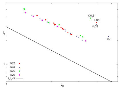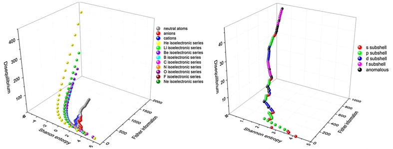 The Shannon entropy in position space Sr behaves like a measure of delocalization or lack of structure of the electronic density in the position space and hence Sr is maximal when knowledge of ρ(r) is minimal and becomes delocalized. The Shannon entropy in momentum space Sp is largest for systems with electrons of higher speed (delocalized γ(p)) and is smaller for relaxed systems where kinetic energy is low. Entropy in momentum space Sp is closely related to Sr by the uncertainty relation of Bialynicki-Birula and Mycielski [53], which shows that the entropy sum ST=Sr+Sp, is a balanced measure and cannot decrease arbitrarily. For one-electron atomic systems it may be interpreted as that localization of the electron’s position results in an increase of the kinetic energy and a delocalization of the momentum density, and conversely.