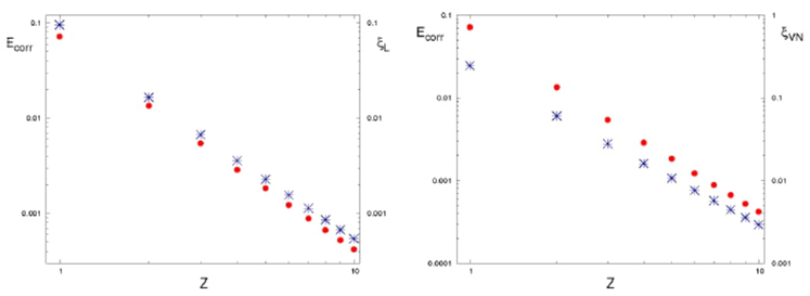 Fig. 23 Correlation energy, Ecorr (dots), and entanglent measures (stars): linear entanglement measure, ξ L , and von Neumann entanglement measure, ξ VN , for helium-like atoms with nuclear charge Z ∈ [1,10].