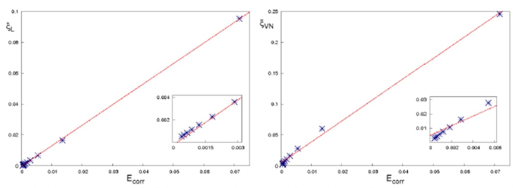 In order to test numerically that E corr is proportional to ξ L and ξ V N , respectively, we have plotted these values in Fig. 24. We have also obtained least-square fits as shown in Table 2. Interestingly, note from Table 2 that the relationship between entanglement and E corr is close to linearity with correlation coefficients, r, higher than 0.99 in both cases.