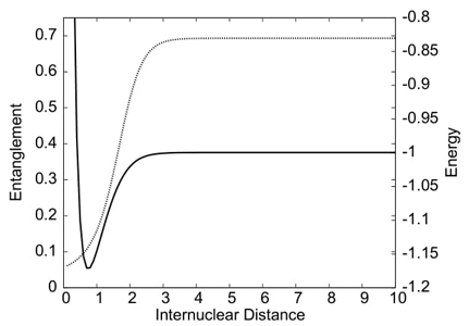 Fig. 25 Entanglement (dotted line) and total energy (solid line) for the dissociation process of the hydrogen molecule.
