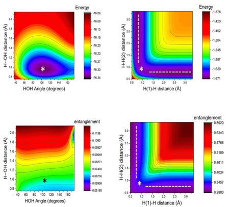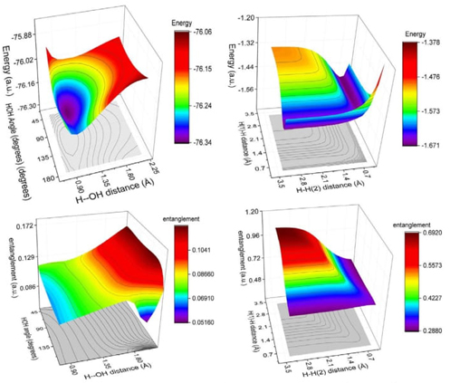 Fig. 27 Contour maps for total energy and entanglement of the water molecule (left) and the hydrogenic abstraction reaction (right).
