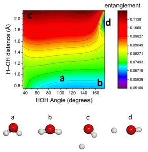 Fig. 28 reveals that the molecular geometry associated with the lowest energy for the water molecule does not coincide with any critical entanglement value (structure a). This disconnection underscores the complexity of quantum behaviors versus classical energetic expectations. For structures b and c, which are associated with higher energy levels indicative of excited states, there is a distinct contrast in their entanglement values. Structure b exhibits lower entanglement compared to structure a, suggesting simpler electronic interactions. Conversely, structure c shows increased entanglement, pointing to more complex electronic behaviors. The minimal entanglement value is observed in structure d, which aligns with the significant geometrical transition at a bond distance of 1.8 to 2.0 Å and an angle of 180°, a configuration indicative of the bond cleavage process. These observations highlight the nuanced relationship between molecular geometry, energy levels, and quantum entanglement. The entanglement contour maps serve as critical tools for identifying regions within molecular systems where quantum effects dominate, influencing both the stability and reactivity of the system. The analysis confirms that while higher energy often correlates with more complex electronic states as indicated by increased entanglement, the specifics of molecular interactions and their rearrangements can lead to unexpected variations in quantum behavior, crucial for understanding chemical reactivity at a fundamental level.