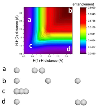 - Structure b, is characterized by being the most-separated molecular geometry, interestingly corresponds to the maximally entangled state. This highlights a key aspect of quantum mechanics where entanglement can be significant even at large molecular separations.