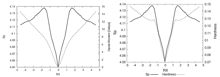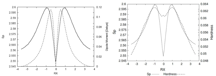 In Fig. 4, the non-polar bond pattern characteristics of homolytic bond-breaking reactions are studied by examining the dipole moment and momentum entropy along the intrinsic reaction coordinate (IRC) path [24]. The dipole moment is zero at the transition state (TS) and when approaching reactants/products, reflecting the non-polar nature of the molecule in these regions. However, the molecular densities undergo significant distortion near the TS, where position entropies are minimal, indicating a rigid molecular geometry with localized position density at the bond breaking/forming regions. The momentum entropy maxima reveal that the energy reservoirs for bond cleavage, referred to as bond cleavage energy reservoirs (BCER), occur earlier or later along the IRC path, depending on the reaction direction. The interplay between dipole moment, position entropy, and momentum entropy provides insights into the complex nature of the reaction and the critical role of the TS and BCER regions in the overall mechanism. Also, in Fig. 4 we have depicted the hardness values along with the momentum space entropy for comparison purposes. From a DFT conceptual point of view we may interpret Fig. 4 as that chemical structures at the maximal hardness (minimal softness) values possess low polarizability and hence are less propense to acquire additional charge (less reactive). According to considerations discussed above, these structures are found at the BCER regions, i.e., they are maximally distorted, with highly localized position densities (minimal position entropies, and maximal dipole moment values, (see Fig. 4). In contrast, hardness values are maximal at the reactant/product complex regions which correspond with delocalized position densities with null dipole moments, hence they are more prone to react (more reactive). At the TS, a local minimum for the hardness may be observed, then it is locally more reactive and leading to acquire charge since its dipole moment is null. Accordingly, the TS structure is more relaxed and with a more delocalized density.