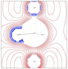Fig. 8 The MEP contour lines in the plane of Ha-C-Hb (Ha stands for the nucleophilic atom and Hb is the nucleofuge, on bottom and top, respectively) showing positive MEP (nucleophilic regions) and negative MEP (electrophilic regions) at RX ≈ -0.3 for the SN2 reaction.
