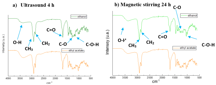 In Fig. 1 FTIR-ATR spectra are presented: a) ultrasound 4 h and b) magnetic stirring 24 h, both using ethyl acetate and ethanol, respectively, as extracting solvents. It should be noted that very similar results were obtained in the four different treatments. At 3345 cm-1 a broad band corresponding to the O-H stretching of alcohols and/or carboxylic acids attached to aromatic rings is observed; at 2930 cm-1 vibration of -CH3 asymmetric stretching is found, and 2850 cm-1, a band characteristic of the vibrations of the methylene group - CH2 symmetric stretching is present, while at 1670 cm-1 the band corresponding to the stretching of the carbonyl bond C=O carboxylic acids and their derivatives such as esters is shown and between 1400 to 1450 cm-1 the bands of the C- H bond torsions are found, as well as at 1000 cm-1 the bands of the C-O-H bonds out of the plane are found. The main groups to be highlighted from the secondary metabolites of Rosmarinus officinalis extract are hydroxyl, carbonyl, and carboxylic acids 24,25. Similar behavior is evidenced in both treatments, which leads to the deduction that the ultrasound treatment is the most recommended, as higher yield percentages are obtained in less time.
