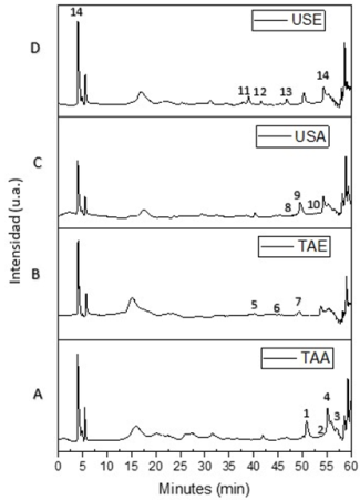 The analysis of the components present in each of the extracts was carried out by HPLC-MS chromatography, where the identification of the different compounds is shown in Table 2, in which the retention times, mass, compound and family are presented. Fig. 3 shows the HPLC-MS chromatograms of the different extracts obtained. As can be seen, the presence of phenolic terpenes, methoxyflavones, hydroxycinnamic acids and alkylphenols was confirmed. The most abundant compound was rosmarinic acid, which presented retention times of 41.31, 43.51 and a mass of 359 1, this compound could only be extracted using ethanol as extraction solvent, because the polarity index of ethanol is higher than that of ethyl acetate, which agrees with Bendif et al 26, who reported the identification of rosmarinic acid with a retention time of 11. 8 min and mass of 278.5, in ethanolic extracts of Rosmarinus eriocalyx obtained by the conventional method. Fig. 2 shows some of the compounds obtained in the extracts of Rosmarinus officinalis.