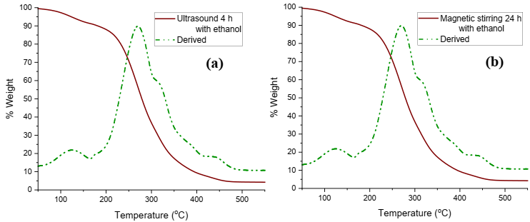 In Fig. 7, in section a) the thermograms of the Nylon 6 nonwoven fabrics impregnated with the extracts of Rosmarinus officinalis using a concentration of 10000 ppm are observed, where the unimpregnated fabric has only a loss in weight of 98 % at a temperature of 444.90 °C, while those impregnated with the ethanolic extracts of Rosmarinus officinalis present a very similar behavior, the first loss is between 120- 270 °C due to the loss of water, the second loss is between 250-400 °C due to the organic compounds present in the extract, as shown in the TGA of the extracts of Rosmarinus officinalis, which present the same behavior, finally the degradation of the fabrics begins around 450 °C.