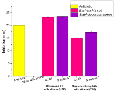 Extracts obtained by ultrasound showed mean inhibition halos of 23.25 mm against Escherichia coli and 23.5 mm against Staphylococcus aureus, while extracts obtained by magnetic stirring showed mean inhibition halos of 15 mm against Escherichia coli and 17. 25 mm against Staphylococcus aureus, as shown in Fig. 5. Martinez et al 33 obtained inhibition halos of 10.90 mm of the aqueous extract of Rosmarinus officinalis against Escherichia coli. On the other hand, Llanos et al 34, demonstrated the antibacterial activity of the mixture of essential oils of Origanum vulgare and Rosmarinus officinalis at 50 %, obtaining inhibition halos of 16 mm against Staphylococcus aureus, using the Kirby Bauer method. Rodenas et al 35 obtained inhibition halos of 15.81 mm of ethanolic extract of Rosmarinus officinalis obtained by maceration against Staphylococcus aureus. Sánchez et al 36, demonstrated the inhibitory effect of ethanolic extracts obtained by maceration of Rosmarinus officinalis against Staphylococcus aureus, finding inhibition halos of 20.88 mm.
