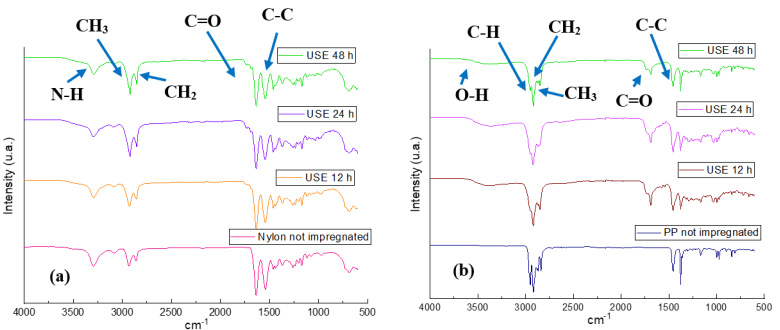 Fig. 6(a) shows the FTIR-ATR of Nylon 6 nonwoven fabrics impregnated for 12, 24 and 48 h with Rosmarinus officinalis extracts using a concentration of 10000 ppm of the extract. In which bands are shown at 3295 cm-1 corresponding to the stretching of the N-H bonds coming from amides present in the structure of the Nylon 6 nonwoven fabric, at 2931 and 2859 cm-1 two bands corresponding to the vibrations of -CH3 (asymmetric stretching) and of the methylene group -CH2 (symmetric stretching) are observed, at 1653 cm-1 the stretches of the carbonyl C=O bond coming from amides are shown, at 1539 cm-1 the bands corresponding to the bending of the N-H bonds are observed and at 1460 cm-1 a doublet corresponding to the C- N stretches coming from amides is shown. As can be observed independent of the impregnation time there are no changes in the chemical structure of nonwoven fabric after it is impregnated with the extracts of Rosmarinus officinalis, when compared with the infrared spectrum of the unimpregnated Nylon 6 nonwoven fabric. While in the incision (b) shows the infrared spectra of the PP fabrics impregnated with the extracts of Rosmarinus officinalis using a concentration of 10000 ppm of the extract, where at 2900 and 2950 cm-1 the bands corresponding to the C-H stretches coming from the polypropylene are shown, at 2850 cm-1 the bands corresponding to the vibrations - CH3 asymmetric stretching and at 2800 cm-1 the bands corresponding to the vibrations of the methylene group symmetric stretching are observed and at 1450 cm-1 the bands corresponding to the C-C17 bond tensions are found, In addition to these bands are shown others located at 3435 cm-1 which correspond to alcohols, phenols and at 1685 cm-1 is the band corresponding to the carbonyl groups present in the chemical structures of the secondary metabolites of the extract of Rosmarinus officinalis25.