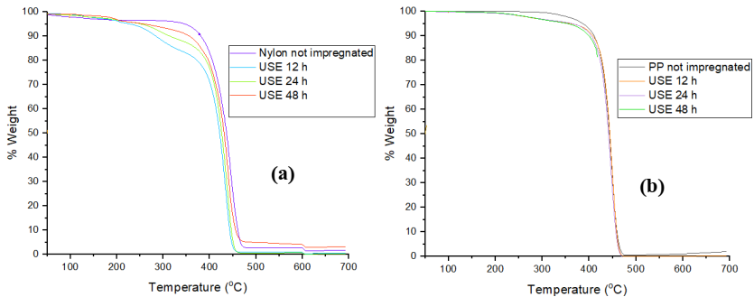 On the other hand, in section b) we have the PP nonwoven fabrics impregnated with the extracts of Rosmarinus officinalis, with a concentration of 5000 ppm, as can be observed, they have a very similar behavior, both the PP fabric without impregnation and those impregnated with the extract. In the unimpregnated fabric a loss in weight of 95 % is observed at a temperature of 449.11 °C, while in the impregnated fabrics a first loss is observed between 200 -270 ºC which is due to water, the second loss is mainly attributed to the loss of organic compounds and is found between 400-450 ºC and the total decomposition of the material occurs at a temperature of 450 ºC.