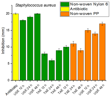 The largest inhibition halos occurred on Nylon 6 and PP fabrics impregnated with a concentration of 10000 ppm of Rosmarinus officinalis extract. Inhibition halos of 18 mm were obtained for USE 12 h, 19 mm for USE 24 h and 20 mm for USE 48 h, while in the fabrics impregnated with the extracts obtained by magnetic stirring, halos of 8 mm were obtained for TAE 12 h, 6 mm for TAE 24 h and 9 mm for TAE 48 h, as shown in Fig. 8.