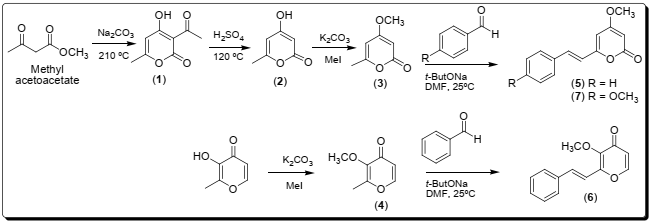 The synthesis of pyrones was carried out in four steps (Scheme 1), starting with obtaining of compound 1 through Claisen condensation between two equivalents of methyl acetoacetate at 169 °C, followed by an intramolecular cyclization yielding a white crystalline solid, yield 53.8 % and melting point of 108 °C. The deacetylation reaction of compound 1 in acid medium at 120 °C for 1.5 h provided compound 2, a white crystalline solid, with a yield of 63.7 % and melting point of 186 °C 17,18. Compound 3 was derived from the methylation reaction of compound 2 using methyl iodide at reflux at 58 °C which gave a beige crystalline solid in 63% yield and melting point of 86 °C. 3-methoxy-2-methyl-4H-pyron-4-one (4) was obtained as an orange oil in 95% yield from the methylation of the compound 3-hydroxy-2-methyl-4H-pyran-4-one with methyl iodide under basic medium at reflux at 58 °C by 3 h. Compounds 1-4 were characterized based on their IR, MS, 1H and 13C NMR spectra. The synthesis of styrylpyrones was carried out through an aldol reaction using sodium t-butoxide as a base under stirring, as previously described by Kraus and Wanninayake 19 with some modifications. The reaction time for the styrylpyrone syntheses 5-7 (Scheme 1) was optimized in 5h using ultrasound radiation with reaction yields 53 %, 39 % and 42 %, respectively.
