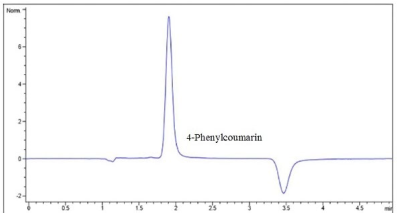 The 5-O-β-Dgalactopyranosyl-7-methoxy-3',4'-dihydroxy-4-phenylcoumarin (4-FC) was quantified from a stock solution of 100 µg/mL in Hank's solution, with the calibration curve prepared in a range of 0.5 to 40 µg/mL and the quality control (LQC, MQC, HQC) samples set at 2, 8, and 25 µg/mL. Concentrations of 4, 8, and 16 µg/mL (in triplicate) were used, in Hank's solution at pH 7.4, to evaluate permeability in MDCK cells. The chromatographic conditions applied for the permeability assay were a Symmetry-C18 column, at 4.6x150mm and 5 μm at a temperature of 25 °C, while the methanol:water acidified with 0.1 % ATF (50:50) mobile phase was applied at a flow rate of 1.2 mL/min, a wavelength of 328 nm, an injection volume of 20 μL, a retention time of 2.0 min ± 0.5 min, and a run time of 5.0 min.