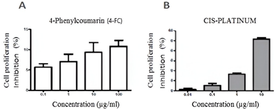 It was determined that, using the SRB colorimetric method, the cytotoxic effect is obtained for 4-phenylcoumarin in the MDCK cell line after 24 hours of treatment. Fig. 4 shows the cytotoxicity results obtained at different 4-FC concentrations together with the positive control in the MCDK cell line, namely cis-platinum.
