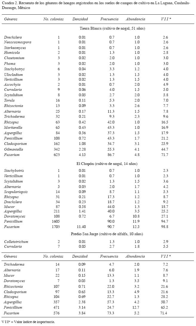 This study was carried out in agricultural soils in La Laguna, Coahuila Durango, Mexico (annual precipitation 80250 mm). The structure of soil fungal genera of three field soil was studied. In soil of Tierra Blanca, an orchard pecan of 51 years, there were isolated 23 genera of soil fungi, and only 12 genera of other two field soils (El Chupón, a pecan orchard of 14 years, and San Jorge, culturing with alfalfa). For each genus of soil fungi there were calculated the Importance Value Index (I V I). The genus Fusarium showed the greater I V I of the three field soils (7198). The diversity (Shannon's index) of genera of fungi was different from each soil according to confidence intervals (95%), with values of 1.89, 1.72 y 1.19 for Tierra Blanca, El Chupón and San Jorge, respectively. Additional ecological indexes were calculated, as Simpson, maxim richness (H' max), regularity (J'). The values of Index Simpson and J' were similar between Tierra Blanca and San Jorge, but only H' max was similar between El Chupón and San Jorge. The similarity index of Shøresen was equal for Tierra Blanca vs. El Chupón, or Tierra Blanca vs. San Jorge (51.4), whereas El Chupón vs. San Jorge was 58.3. The index β for the genera of fungi in Tierra Blanca vs. El Chupón or Tierra Blanca vs. San Jorge was 0.48, but San Jorge vs. El Chupón was 0.83. The genera of soil fungi found in La Laguna are 6775% similar to soil fungi isolated from desert, such as the Israel desert, but in soils of La Laguna the structure of genera fungal is different; here Fusarium is the most abundant, and appear new genera such as Trichoderma. The changes of soil mycobiota could be the result of the effect of agricultural activity during the last 50 years.