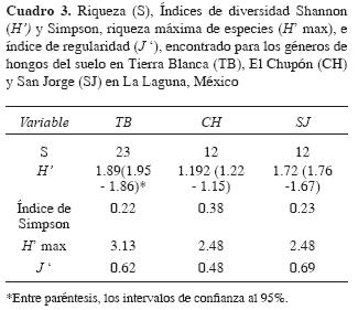En Tierra Blanca se recobraron 23 géneros de hongos del suelo y mostró el valor más alto de H'. En los demás predios sólo se recobraron 12 géneros, aunque en San Jorge hubo un H' superior al de El Chupón; en todos los predios los intervalos de confianza de H ' no se traslapan. El valor más alto del índice de Simpson se obtuvo en El Chupón, y en los otros 2 predios sólo difirió en 0.01; en contraste, el índice de regularidad fue muy similar entre Tierra Blanca y San Jorge y casi la mitad en El Chupón, como se muestra en el Cuadro 3.