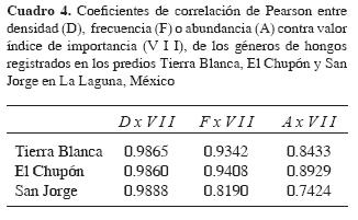 El orden de correlación de Pearson fue < abundancia < frecuencia < densidad con el V I I en cada predio como seaprecia en el Cuadro 4.