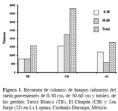 En La Laguna, Phymatotrichopsis y Rhizoctonia son hongos del suelo que atacan los cultivos de nogal y de alfalfa, respectivamente; aunque no fueron asilados, el primero es desfavorecido por el incremento de residuos de cosechas de cultivos agrícolas (Papavizas et al., 1975), mientras que el segundo tiene un comportamiento opuesto (Chavez et al., 1976; Streets y Bloss, 1973). Tanto en Tierra Blanca como en San Jorge se encontró Trichoderma, un género cuyas especies pueden parasitar o ejercer otros efectos antagónicos sobre algunos hongos fitopatógenos incluyendo Phymatotrichopsis y Rhizoctonia. Trichoderma no es típico de ecosistemas desérticos; no obstante, en la zona desértica de Arizona, EUA su presencia fue asociada con suelos cultivados con vid Vitis vinifera L. a la cual se le aplicaron fertilizantes ácidos durante 10 años (Olsen et al., 1988). Tal vez en La Laguna, el cultivo de nogal esté favoreciendo el establecimiento de Trichoderma, particularmente en huertos mayores a 20 años, pues en más de 10 diferentes tipos de suelos cultivados con algodonero (Gossypium hirstium L.) no fue posible recobrarlo, aún después de utilizar más de 3500 placas, pero sí se pudo aislar de 5 suelos con huertas de nogal (datos no publicados).