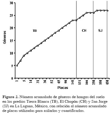 Después de utilizar alrededor de 300 placas el número acumulado de distintos géneros de hongos registrados en los 3 predios se estabilizó, como se aprecia en la Fig. 2.