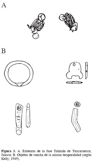 En lo que hoy es el estado de Jalisco, se han efectuado trabajos en las regiones de Tuxcacuesco y Sayula, en el sur de la entidad. Kelly aporta información de la primera; allí trabajó entre 1939 y 1942. Definió varios complejos cerámicos y temporales interesando aquí el conocido como Tolimán, que tiene los mismos límites que el anterior (Kelly, 1949; Schöndube, 1980). Las inhumaciones de este periodo tienen posiciones extendidas y flexionadas (Fig. 3A), las primeras suelen ser de niños y las últimas de adultos. La orientación de la cabeza es variable, puede apuntar al este, al oeste, al suroeste, al norte o al sur; mientras que las ofrendas son colocadas hacia la cabeza, la pelvis o los pies (Kelly, 1949). Como suele suceder, entre los objetos que acompañan al cuerpo se encuentran artículos cerámicos, líticos y de concha, entre otros.