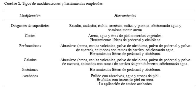 Posteriormente se efectuó un análisis de las huellas de manufactura de los objetos de concha, basado en los estudios realizados en el "Proyecto de arqueología experimental en materiales conquiológicos" y el "Proyecto de técnicas de manufactura del México prehispánico", ambos bajo la dirección de Velázquez (2004). En el primero, han sido reproducidos en el taller de arqueología experimental los diferentes tipos de modificaciones que presentan los objetos –percusiones, desgastes, cortes, perforaciones, incisiones, calados y acabados−, partiendo de la obra de Suárez (1974). Para ello se han empleado las herramientas y procesos que, por diversas fuentes de información, es posible suponer que fueron utilizados por los distintos pueblos del México prehispánico, como aparece en el Cuadro 1.