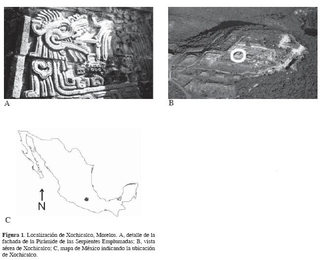 Xochicalco se encuentra emplazado sobre cerros y barrancas en la parte norte del valle de Morelos, como los cerros Xochicalco, La Malinche y La Bodega en el estado de Morelos (Figs. 1B, 1C). A pesar de la vida efímera de este asentamiento, alrededor de 300 años, su posición estratégica dentro del valle y el control que ejerció sobre la ruta de circulación de productos (terrestres o marinos) de Michoacán y Guerrero, siguiendo la cuenca del río Balsas hacia el altiplano central (Kolb, 1987), permitió que este sitio concentrara y restringiera la distribución de determinados materiales en la región, como los exoesqueletos de moluscos marinos.