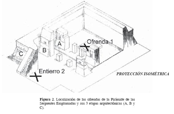 El material malacológico estudiado está conformado por 258 piezas, 242 completas y 16 fragmentos, que se encuentran depositadas en 4 lugares (en una bodega del "Proyecto Xochicalco" en el Centro INAHMorelos de Cuernavaca, en el Museo de Sitio de Xochicalco, en el Museo Nacional de Antropología e Historia y en la bodega del Laboratorio de Arqueozoología del INAH, estos 2 últimos en la Ciudad de México). Proceden de las ofrendas descubiertas por Sáenz (1963) en 19621963 y el equipo de González Crespo et al. (en prensa) y Garza Tarazona en 1994, durante excavaciones realizadas en la Pirámide de las Serpientes Emplumadas en Xochicalco, Morelos. Las primeras corresponden a entierros secundarios de la etapa A (Fig. 2), un edificio anterior a la Pirámide de las Serpientes Emplumadas formado por un cuarto con altar y fechado para el 600 d.C. (González et al., en prensa). Estas ofrendas se caracterizan por presentar conjuntos de pendientes (Fig. 3A) o estar pigmentadas con cinabrio, sin importar que algunos de los moluscos sean de tonos rojizos, incrementando con ello su color. Dentro de ellas destaca la Ofrenda 1 compuesta por varias valvas de moluscos y sartales de pendientes de caracoles marinos, ubicada al centro de la estructura (Fig. 2), así como el Entierro 1 hallado entre los pilares, cuya ofrenda también presentó varios pendientes de caracoles marinos, un disco de piedra y 2 placas de jade decoradas con personajes antropomorfos (Sáenz, 1963). Además, las ofrendas recuperadas por el Proyecto Arqueológico Especial Xochicalco forman parte del ajuar funerario del Entierro 2, correspondiente a la etapa C de esta estructura (Fig. 2), cuando ya fue construida la Pirámide de las Serpientes Emplumadas hacia el 750800 d.C. (González et al., en prensa). Se trata de un entierro primario descubierto al desmontarse la escalera de acceso, entre el tercero y quinto escalón, en una rotura del piso de la estructura. El esqueleto corresponde a un individuo entre los 13 y 17 años de edad, depositado en posición de decúbito lateral derecho flexionado, acompañado por una importante ofrenda funeraria constituida por un cráneo infantil, 5 cilindros tallados, 65 cuentas de piedra verde de distintos tamaños, 12 cuentas en forma de cantaritos, un sartal de 20 pendientes de caracol en forma de cráneos con incrustaciones de pirita en los ojos, un pectoral de concha, varias cuentas nacaradas, varios pendientes de caracol (Fig. 3B), cuentas de barro, algunos fragmentos de un vaso de alabastro, espinas de maguey y carbón (Garza, 1995).