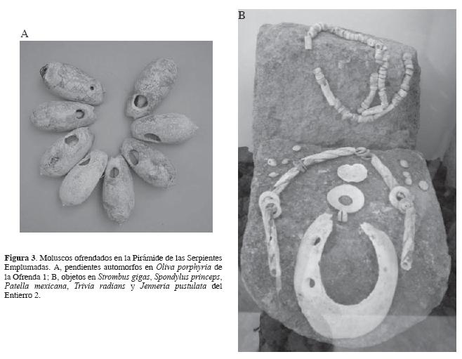 Son notables las diferencias existentes entre las piezas de concha depositadas en las ofrendas de acuerdo con su temporalidad. Por un lado está la poca diversidad de los moluscos de los entierros secundarios, ya que todos son exclusivamente de las costas del Pacífico; además, la mayoría están sin modificar, aunque hay algunos pigmentados con cinabrio, así como los sartales de un solo tipo de objeto, es decir, los pendientes automorfos de O. porphyria, O. julieta y O. incrassata. Aunado a lo anterior, cabe señalar que son los más antiguos de esa estructura, correspondientes a la etapa A, fechada para el 600 d.C. (González et al., en prensa). Por el otro lado, los moluscos del ajuar del entierro primario, fechado para la etapa C de esta estructura , ya construida la Pirámide de las Serpientes Emplumadas, hacia 750800 d.C. (González et al., en prensa), presentan la mayor variedad de especies y objetos, incluyendo 3 especies caribeñas, M. cf. apicina, S. gigas y P. gigantea, lo que podría indicar una apertura de rutas con el Golfo de México, o el establecimiento de nexos con grupos de aquella región. También, el tiempo invertido en la elaboración de estos objetos (cuentas, pendientes xenomorfos –aquellos que pierden la forma natural del molusco del cual están hechos− y pectorales) es mayor en comparación con el invertido en elaborar los pendientes automorfos de las primeras ofrendas, ya que la mayoría presenta más de una modificación en su manufactura.