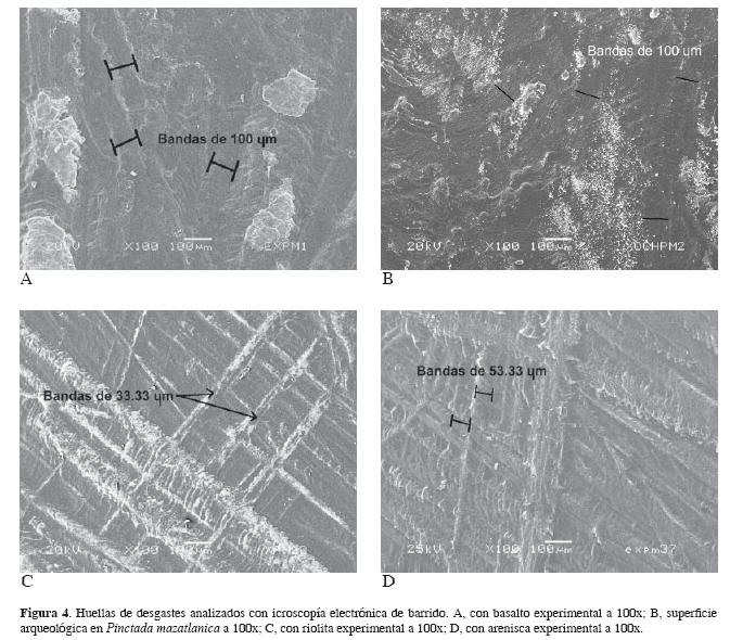 Con base en ello, las huellas de manufactura resultantes fueron comparadas tanto macroscópica como microscópicamente con el material arqueológico. El empleo del microscopio electrónico de barrido (MEB) modelo JEOL JSM6460LV en el segundo proyecto ha ofrecido los mejores resultados para poder distinguir las características morfológicas de la superficie de los materiales: topología, rugosidad, porosidad y tamaño de las partículas que los constituyen. A su vez, para llevar a cabo las comparaciones entre las diferentes muestras, las micrografías fueron obtenidas empleando los mismos parámetros (modo HV, haz de 45, voltaje de 20kv y distancia de 10mm) y observadas en 4 amplificaciones: 100x, 300x, 600x y 1000x (Velázquez, 2004). Asimismo, para agilizar el análisis, en dicho proyecto se realizan réplicas en polímeros, lo cual permite ingresar varias modificaciones a la vez (hasta 20). Con ello han podido obtenerse huellas de piezas que superan el tamaño de la cámara de muestreo, mayores a 10 cm, o de algunas modificaciones de difícil observación, como las paredes internas de las perforaciones. Esta técnica ha permitido incursionar en el estudio de la eficacia de las herramientas y los tiempos invertidos en la elaboración de objetos, así como en la identificación de preferencias culturales y tradiciones tecnológicas en diferentes regiones de México (Velázquez et al., 2004; Velázquez y Melgar, 2003).