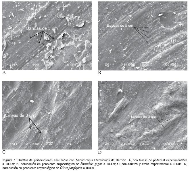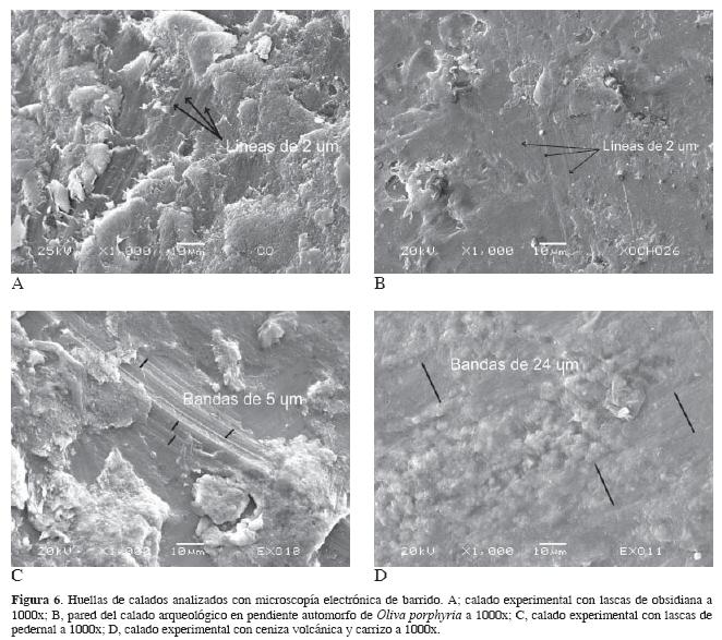 En cuanto al análisis de las huellas de manufactura con microscopía electrónica de barrido, las 44 piezas elegidas dieron los siguientes resultados: a) 16 piezas presentaron la cara dorsal o ventral cruzada por bandas irregulares y redondeadas, del orden de las 100 µm de espesor, las cuales coincidieron con las producidas por el desgaste experimental con basalto (Figs. 4A, 4B), mostrando una notable diferencia con las superficies trabajadas con otras lajas, como riolita o arenisca (Figs. 4C, 4D): 7 en S. gigas, 3 en P. mazatlanica, 2 en P. gigantea, 2 en S. princeps, 1 en P. mexicana y 1 en T. radians; b) 14 piezas mostraron bordes atravesados por líneas finas rectasparalelas o sinuosas de 2 µm de anchura, similares a las huellas producidas por el corte experimental con lascas de obsidiana: 7 en S. gigas, 3 en P. mazatlanica, 2 en S. princeps y 2 en P. gigantea; c) 7 piezas con horadaciones cruzadas por bandas rectasparalelas de aproximadamente 5 µm de espesor, llegando a formar rebordes de mayores dimensiones y rupturas disparejas de la estructura cristalina de la concha, similares a las huellas de perforaciones experimentales hechas con lascas de pedernal (Figs. 5A, 5B): 4 en S. gigas, 2 en S. princeps y 1 en P. mazatlanica; d) 4 piezas presentaron paredes atravesadas por líneas de aproximadamente 3 µm de anchura, las cuales se unen para formar rebordes de mayores dimensiones, similares a las perforaciones y calados producidos experimentalmente empleando arena y carrizo (Figs. 5C, 5D): 4 piezas, todas con Oliva.e) 2 piezas presentaron líneas finas de 3 µm de anchura, similares a las incisiones experimentales realizadas con lascas de obsidiana: 1 cuenta helicoidal y 1 pendiente en forma de cráneo hechos con S. gigas; f) 4 piezas presentaron en los calados líneas finas de 2 µm, similares a las hechas con lascas de obsidiana, algunas de las cuales estaban regularizadas con pequeñas lajas de basalto, debido a las bandas de 100 µm de espesor sobre los rasgos anteriores (Figs. 6A, 6B) y siendo muy diferentes a las producidas mediante el empleo de lascas de pedernal o ceniza volcánica (Figs. 6C, 6D): 4 pendientes, todos con especies del género Oliva.